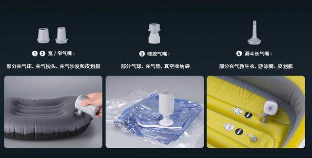 在户外的时候,充气帐篷、充气垫子、充气枕头等在切换不同的接口就可实现充气(抽气)。