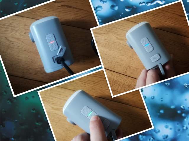 在充电以及使用的时候,指示灯会亮起,其绿色是电量大于50%的说明,蓝色是少于50%的指示,红色是少于10%的指示。充电的时候则是红色闪烁。满电为绿色。