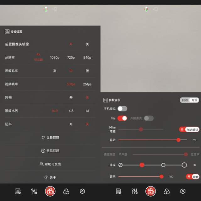 小编手上的麦克风是单支,在使用过程用需要配合APP连接使用,可以在APP上调节各项参数,包括视频的画质和收音效果都可以自由设置。