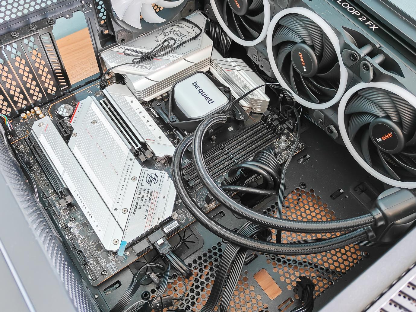 CPU散热器使用的是德商德静界的PURE LOOP 2 FX 360水冷散热器,德商德静界的英文是be quiet!,意思是安静。我们看这款水冷散热器的外观,可看到是360冷排,3个120mm风扇,是带有兼具性能和降噪的Light Wings风扇。同时,它的水泵是外置的,采用了双重减震PWM水泵设计,可以增大流量,减少噪音。