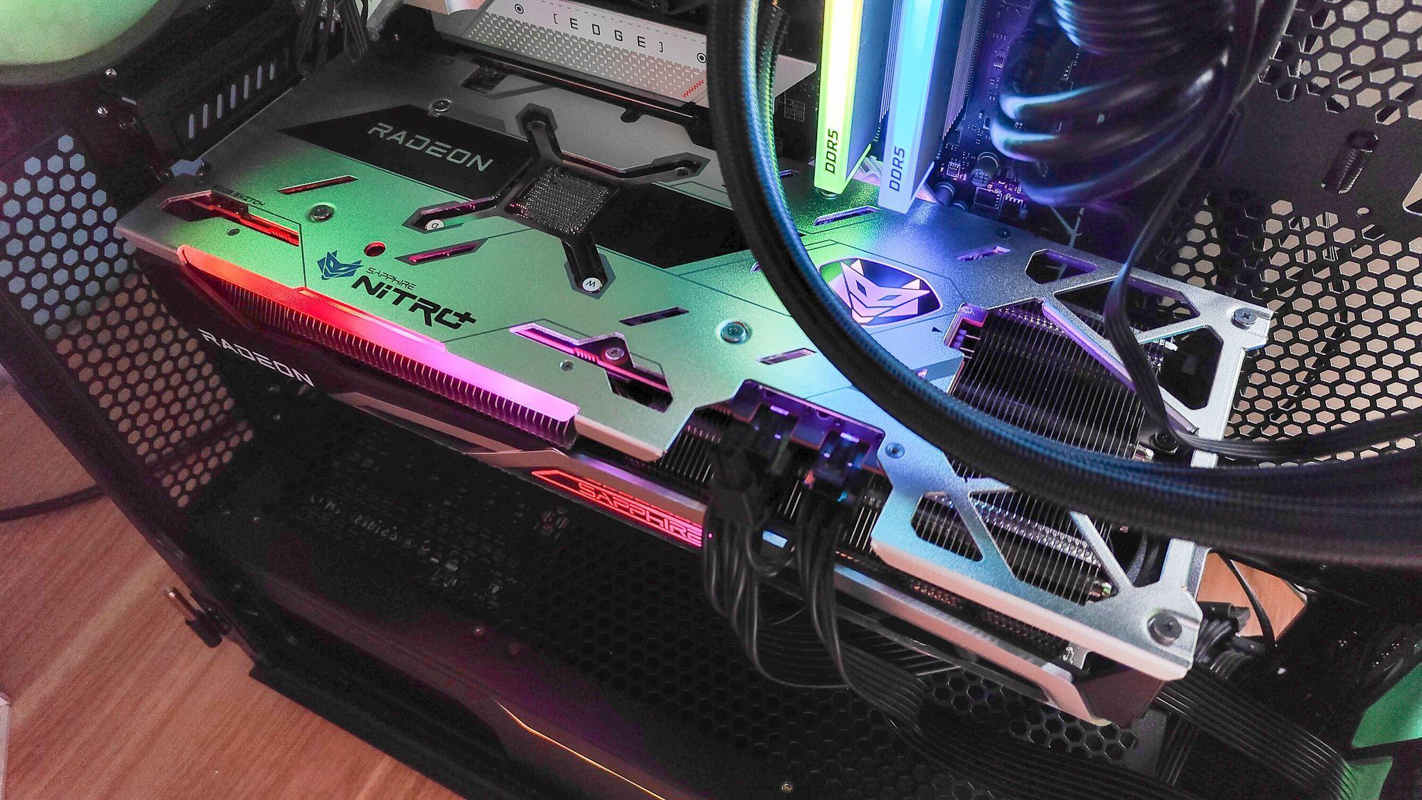 在显卡的尾部可以看见有ARGB外接接口,这款显卡带有ARGB灯效,可以通过蓝宝石的TriXX软件设置各种灯效,也可以通过这个接口连接主板的ARGBGA接口,实现全电脑ARGB彩色效果的统一控制。很多人说哎呀我不喜欢这个ARGB彩灯,那么通过软件关闭就是了。