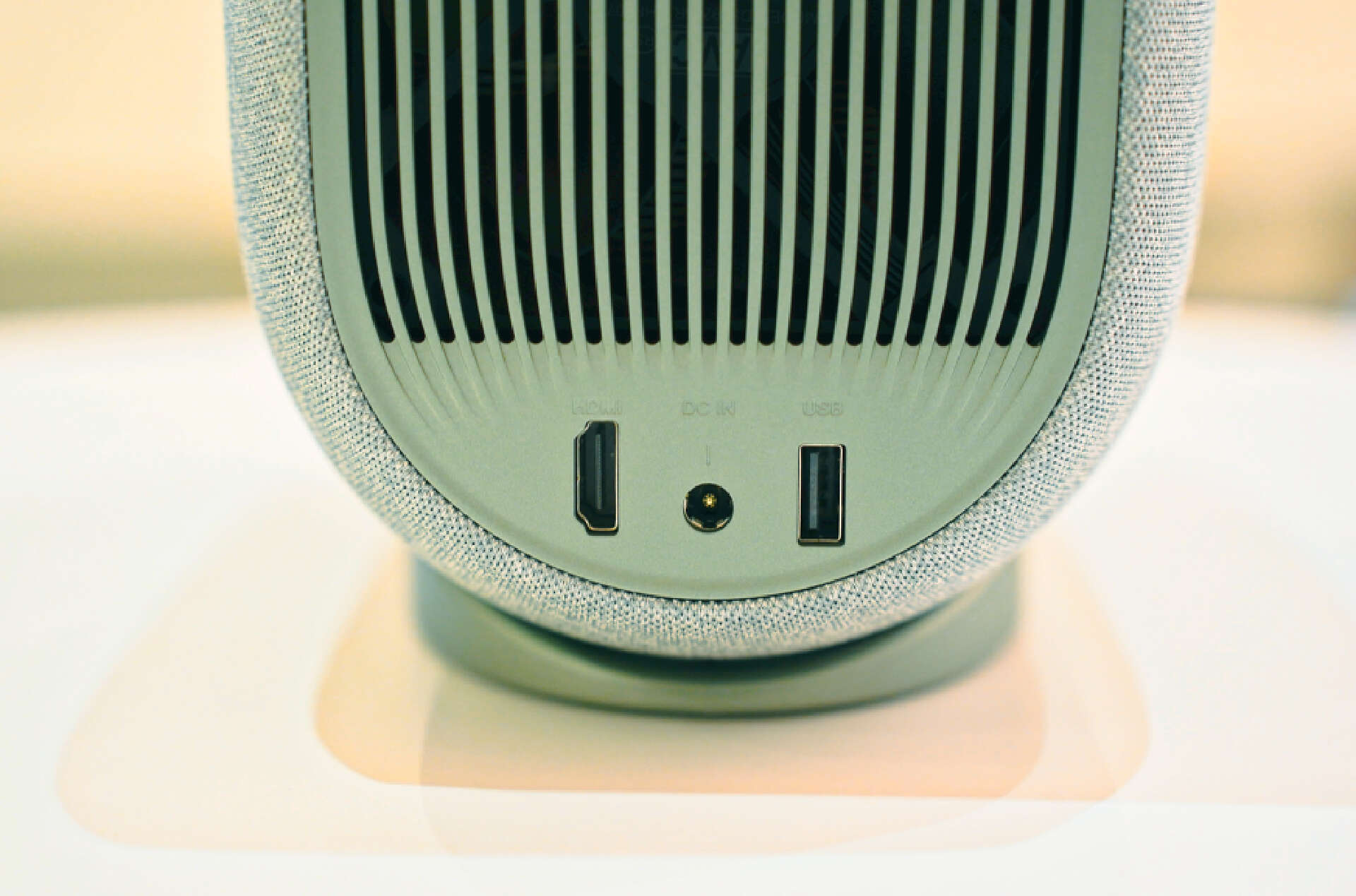 中间段则是音响和散热孔,下面几个接口分别是电源接口,高清HDMI接口和USB接口。