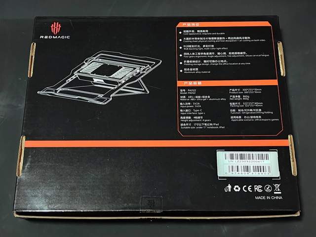 而在包装的背面,同样以纯黑为主色调的底色设计,以黑底白字带来了红魔笔记本散热器的产品特征的介绍和详细的产品规格信息,以及符合相关安全认证的logo标识。其中,这里还带来散热器用线条勾画出的图样,更加突显出散热器的与众不同的魅力所在。