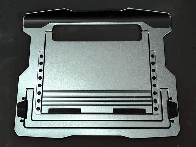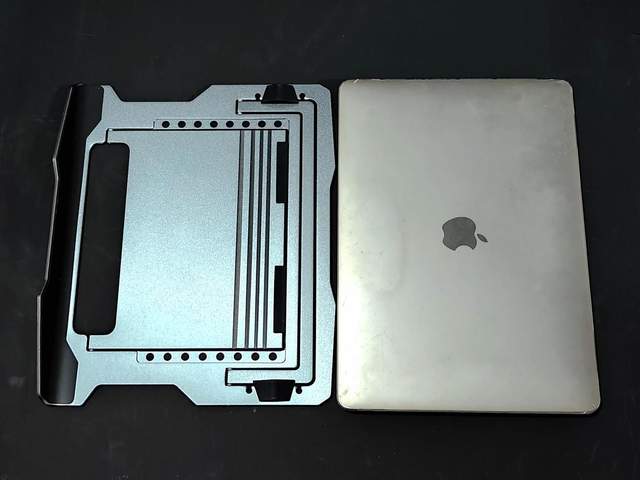 取出由纯白泡沫薄膜包裹物件,可以发现这个则是红魔笔记本散热器的支架部分,整体由加硬全铝合金打造,大小尺寸如同一台13.3寸的MacBook Pro大小相符。同时,在支架的正反面关键部位接触面上,都附带有大面积硅胶防滑胶垫设计,不仅起到对笔记本很好的防滑作用,还能防止笔记本被加硬全铝合金支架刮花。