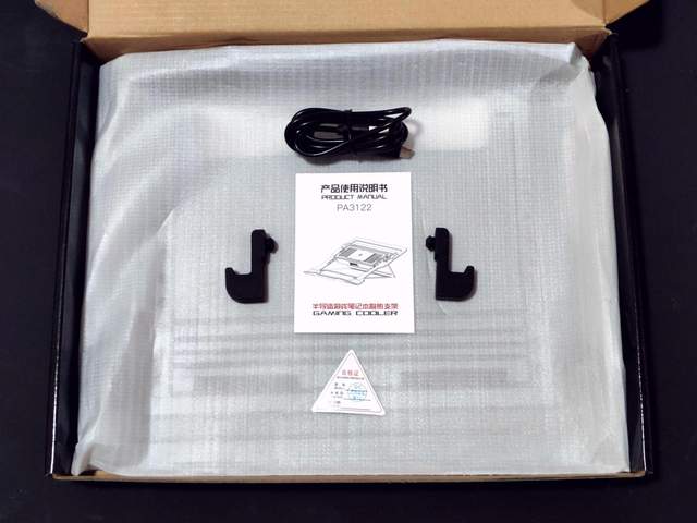 取出上层的纯白纸托后,在下方带来了一个由纯白泡沫薄膜包裹的物件,同时还带来了红魔笔记本散热器两样纸质东西,分别是《产品使用说明书》和《合格证》。还有2个纯黑圆角设计的可拆卸硅胶软垫和一条纯黑抗拉扯的Type-C接口的供电线。
