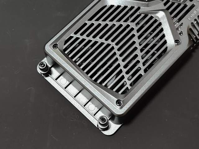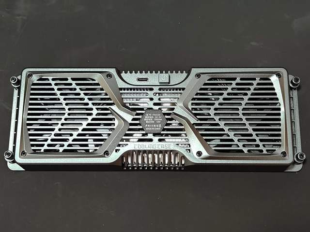 而在散热核心的背面,几乎全部采用了镂空的设计,可以清晰看见其内部的构造,这里重点带来了三个强劲散热效果的涡轮风扇。而在中间部分则附带有红魔笔记本散热器的产品铭牌,以及Type-C供电接口和电源开关。