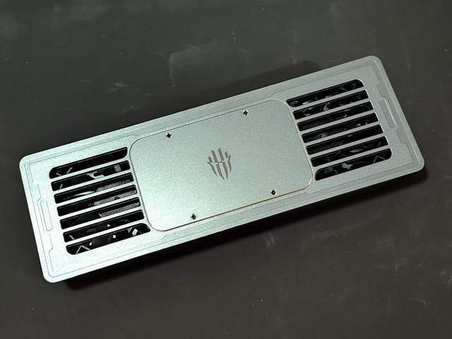 而红魔笔记本散热器核心散热部分,则与支架部分采用了独特分体组合的设计。其中,正面正中间部分印刷有红魔logo的位置,则是1600mm2超大定制半导体散热制冷片散热板,两侧并列各带来了一个低噪声电机的涡轮风扇,带来了立体式大风量输出,快速带走笔记本外壳上的热量。