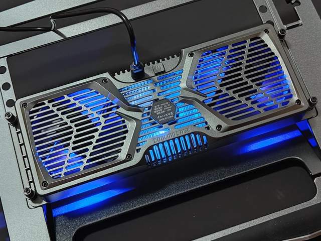值得一提的是,作为电竞品牌的红魔,继续在这款红魔笔记本散热器中加入了独特RGB炫彩灯效电竞元素。只要接通电源并开启开关后,在两侧的风扇上会亮起酷炫的蓝色炫彩灯,同时在中间半导体制冷散热板处,则带来能够变换颜色的RGB炫彩灯。