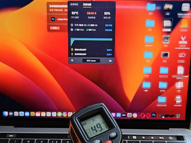 接着,就是MacBook Pro使用前后的实测数据对比:在没有使用红魔笔记本散热器前,MacBook Pro机内CPU温度直接飙升至62°C或更高,内置的两个涡轮风扇转速高达6800多转,并伴随着叫嚣的声音,而且键盘处温度用测温枪测量已经是49.1°C了,温度与噪点真的十分让人难受。