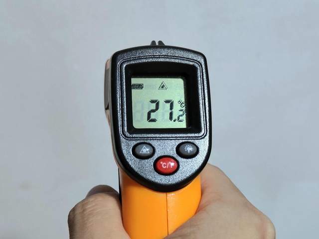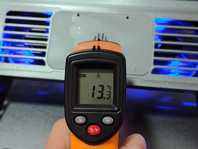 在室温27°C左右的环境下进行空载实测,把红魔笔记本散热器接通电源后并开启,开了不到5分钟,在印刷有红魔logo的散热板上就凝结有一层水雾,使用测温枪对其表面进行测量,直接把温度降低到13.3°C,将近对半开的降温效果,其散热效果简直是十分出色与强悍表现,完全是无可挑剔的。