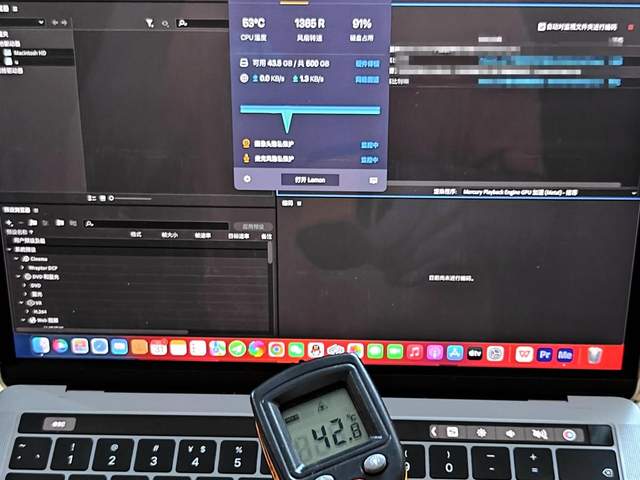 让MacBook Pro使用散热器上后,直接在使用Pr、Me进行视频的剪辑与压制,MacBook Pro高强度工作下,也好像被冻“感冒”了一样,CPU的温度只在53°C上下波动,重点的是机内的两个涡轮风扇基本上在1300转左右,完全没有了噪音的困扰,而且键盘处的温度也降低到42.8°C,整体的使用体验都相对比没有使用散热器都十分舒服怡人。