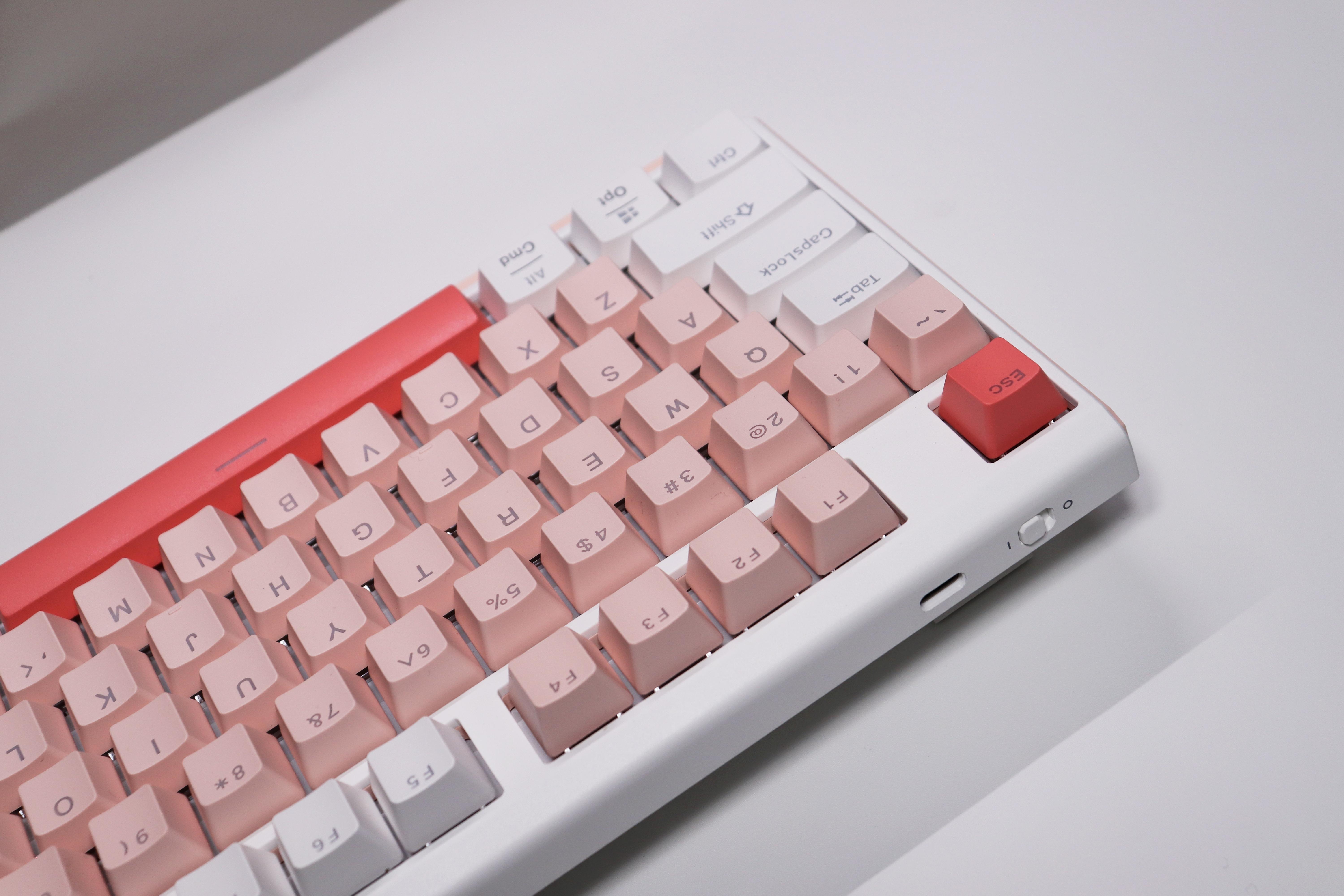 始于颜值在杜伽K615W余音配色的身上是体现的淋漓尽致。杜伽K615W在机身设计上采用双拼叠层设计,机身一圈粉色与键盘的主键位区域遥相呼应,键帽依然是三色设计,它选用的粉色恰到好处,不仅是女生喜欢,我一个男生都沦陷了!