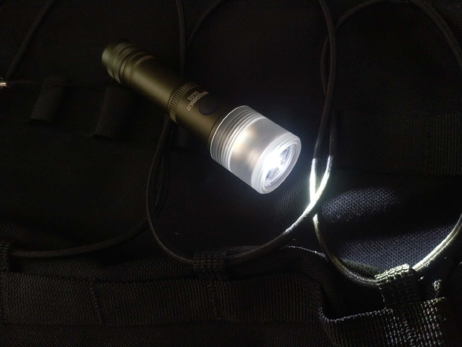 主灯开启,光线经过光杯集中反射在了筒头的前方,这时候就是一支高性能的手电,主灯最高亮度1020流明。
