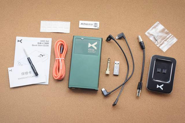 来张附赠各配件的“全家福”展示吧:抛去各“片纸”,乂度在线材上下足了诚意,橙色双头Type-C充电线,适用于安卓、苹果设备的USB C\Lightning OTG连接短线各一根(捆绑用),AES线一根、USB A to C转接头一枚,拆用螺丝刀及螺丝5个,6.35mm插头以及可反复清洗使用的硅胶脚垫十枚,与XD05Bal一样,十分丰富。