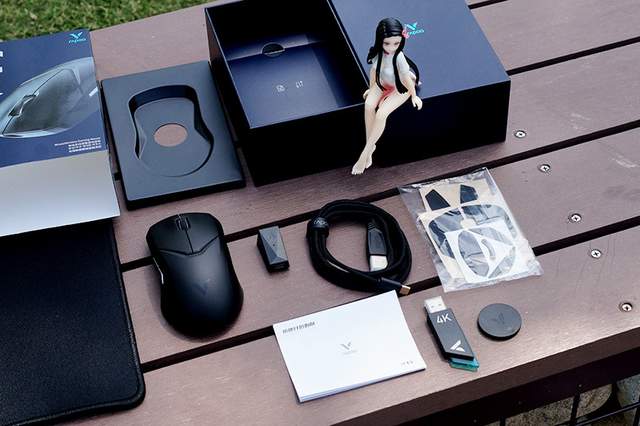 最后拆开VT9双模无线鼠标的包装,它里面的配件还挺多的,虽然是无线鼠标,但它配有一根1.8m长的伞绳数据线,手感软硬适中,即可为鼠标充电,也能让它化身为有线鼠标。