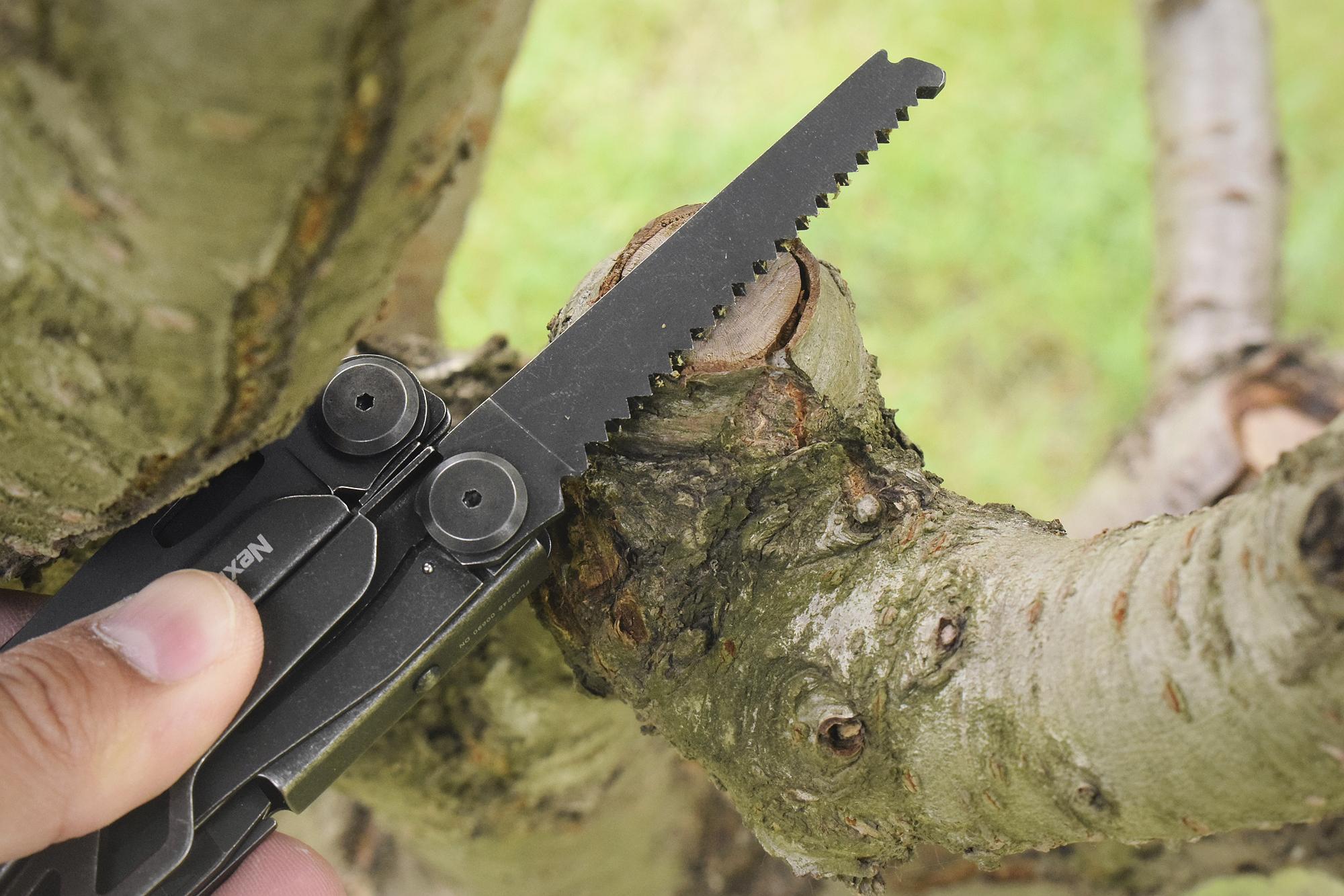 左右两翼伸展开后,与木锯相关联的一端还集成有开罐器、剥线器、割绳刀和十字批头。这些小工具在日常生活中都能用得着。特别是一些家具用的久了螺丝难免会出现松动,拧个螺丝还是很方便的。