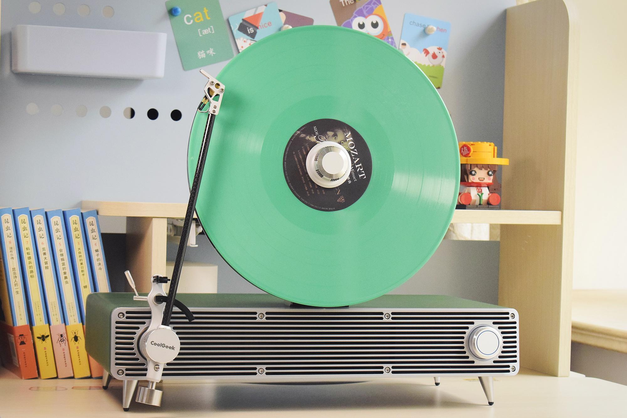 终于可以听我的《莫扎特效应1小舞步曲》啦,在说声音之前先来给大家普及下小知识。很多人一直有个误解,那就是认为黑胶唱片的颜色一定是黑色的,其实黑胶的颜色还是很丰富的,包括尺寸,甚至形状都有不同。以我这张唱片为例,就是嫩绿色,跟同为碧绿的VS-01机身很搭。五颜六色的唱片不只是满足了听觉上的享受,更带来了视觉上的冲击。另外,黑胶是需要安静的去听的。它不像CD或手机那样可以随意切换曲目,而是要耐起性子完整的听下来。我最近听都是选择在了细雨时的午后,泡上一杯咖啡,格外有情调。