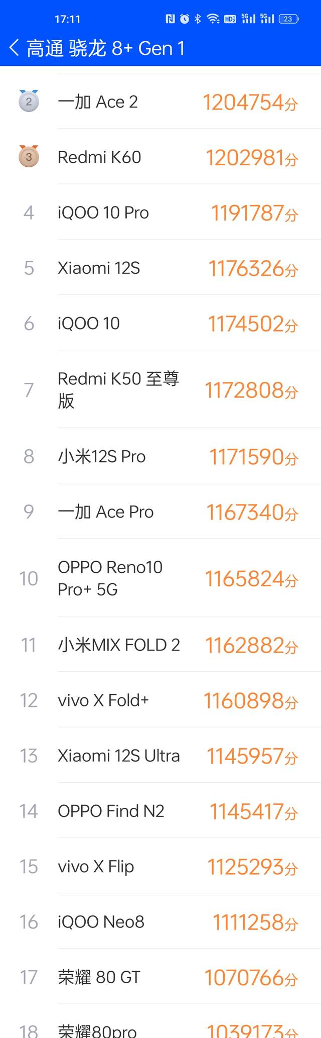 在核心性能上来说,一加Ace 2和荣耀80 GT虽然都采用了骁龙8+ Gen1旗舰处理器,但一加Ace 2用的是满血版3.2Ghz,荣耀80 GT用的是3.0Ghz版本。从鲁大师的排行榜来看,相比荣耀80 GT的性能要好上不少,跑分相差近13万分。