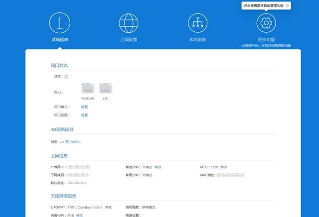 激活后可以快速联网登陆后台进行设置,其实功能页面看,和一般家用路由器后台机会相同,基本没什么操作难度。