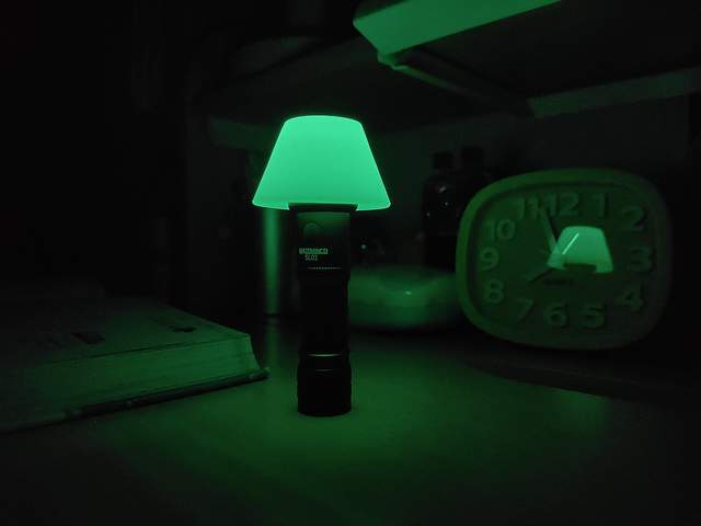 柔光罩是硅胶材质的,本身带有夜光(熄来后当作摆件也挺有氛围感的)。将之套在手电灯头上就可以立在桌面上当做台灯或小夜灯使用。