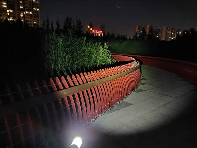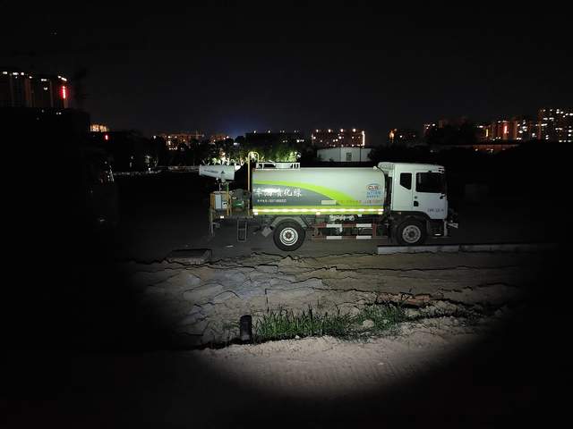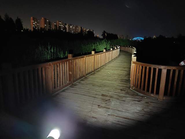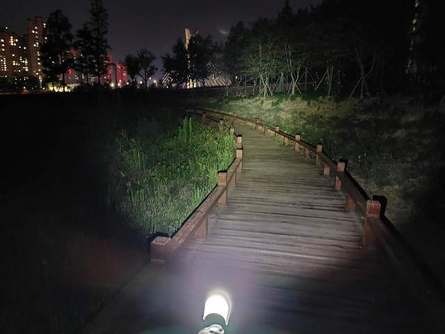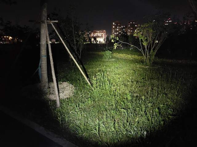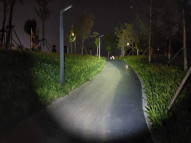 夜射方面,主灯开启后可达上千流明,当作EDC手电通勤使用还是不错的。不过因为是PC灯罩的关系,它的灯光会向四周发散。前方及两旁道路都能被照拂到。