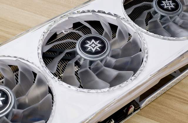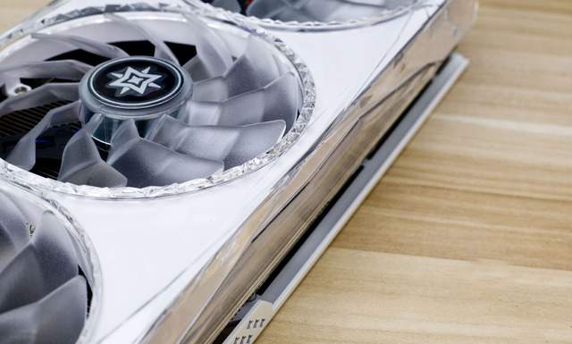 显卡全透明外壳的多种切割造型设计,让显卡看起来更富动感,而且每个散热都有一圈“水晶”包裹,视觉冲击更为强烈。