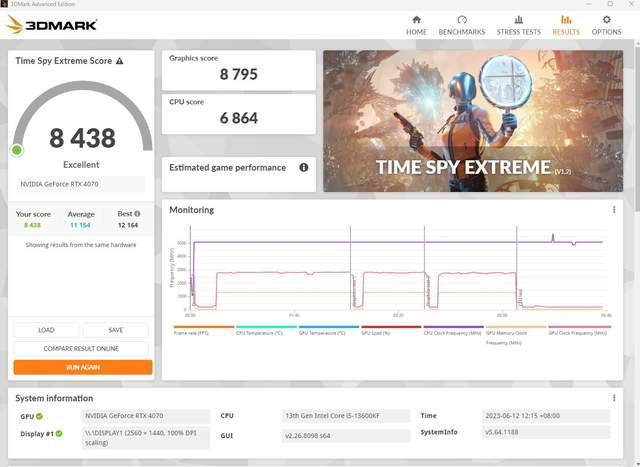 3DMark Time Spy Extreme项目,Time SpyExtreme 是4K DirectX 12 基准测试,可在3DMark进阶版和专业版中进行体验。用户无需通过4K显示器来运行,但需要一个至少具有4GB专用内存的GPU。影驰RTX 4070 星曜 OC分数是8795。