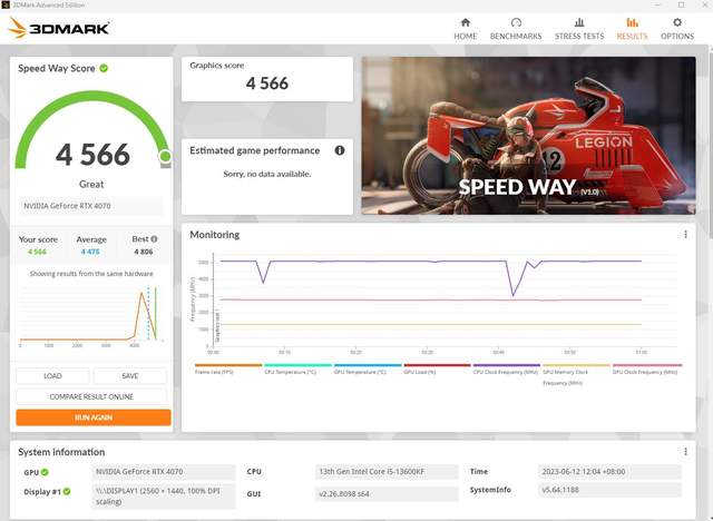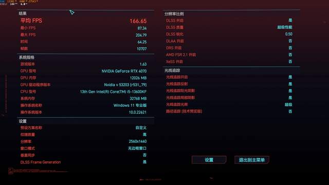 在开启了DLSS3之后,《赛博朋克2077》自带Benchmark的最终结果为平均166.65FPS,直接拉爆了,可以说已经完全没有卡顿可言。