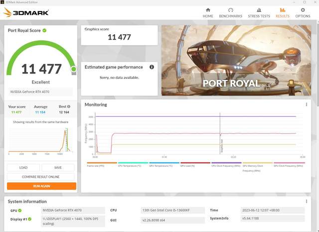 3DMark PortRoyal 是世界上第一个针对游戏玩家的实时光线追踪基准测试。影驰RTX 4070 星曜 OC分数是11477。
