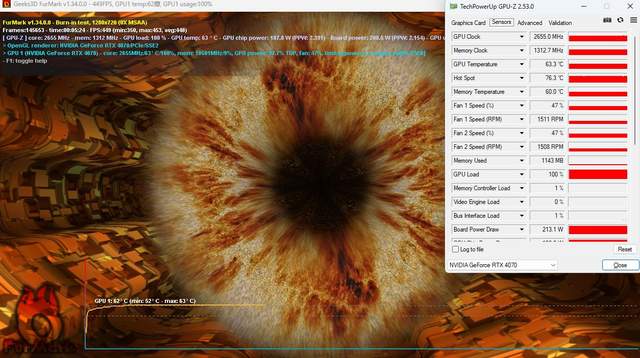 拷机温度和功耗方面,在开启Furmark进行压力测试5分钟之后,显卡的核心温度仅有63.3℃,HotSpot温度也只有76.3℃,此时显卡功率为213.1W,这个表现还算不错。