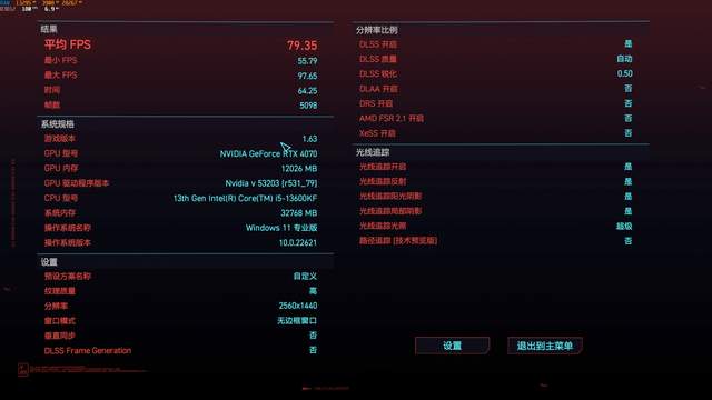 在《赛博朋克2077》当中,2K分辨率开启最高光追画质+无DLSS的设定下,自带Benchmark的最终结果为平均79.35FPS,其实这个帧数野基本够玩了,玩了一会也挺顺畅的。