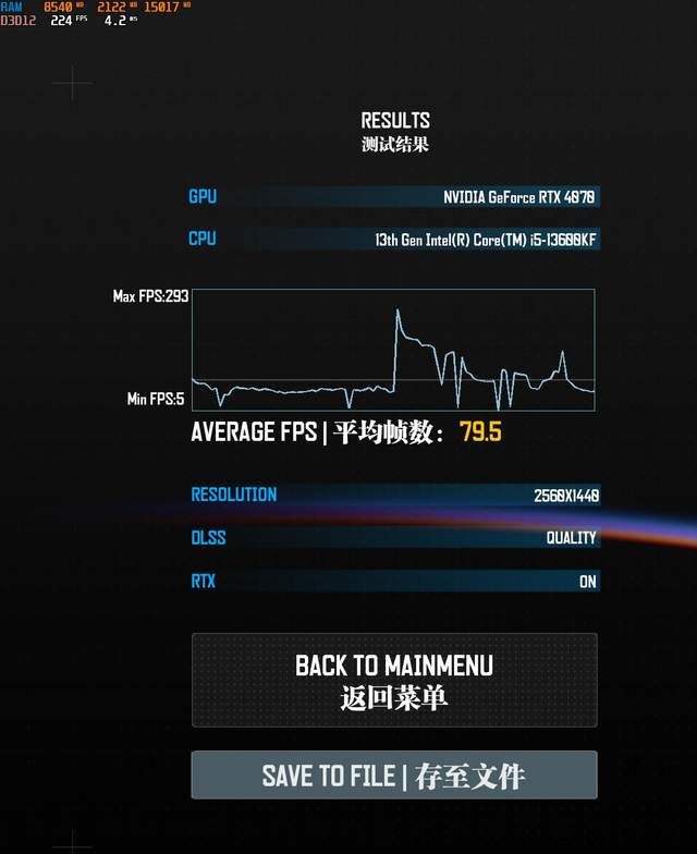 在另外一款国产光追大作《边境》当中,同样是2K分辨率+开启光追+质量DLSS的设定,Benchmark性能测试的测试结果为79.5FPS的平均帧率,没问题。值得一提的是这个benchmark在steam使免费的,大家可以下载来跑跑测试看看成绩。