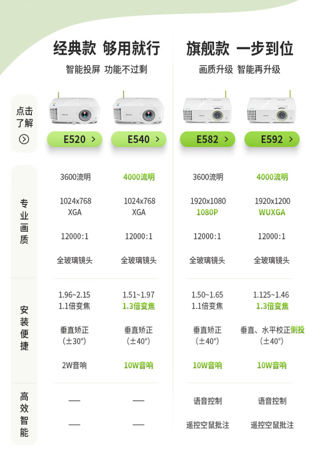 作为专为商务办公场景打造的智能投影仪,明基E系列拥有多款机型,分为经典款和旗舰款。其中,经典款包含E520、E540,旗舰款包含E582、E592。经典款与旗舰款均有着高亮高对比度的专业商用画质,以及易用性比较高的智能系统和专业商务UI。至于如何选择,在我看来,覆盖日常办公的基础功能,E540基本都可以实现,如果想要更高清晰度或者更多智能功能,也可以考虑旗舰款E582、E592~