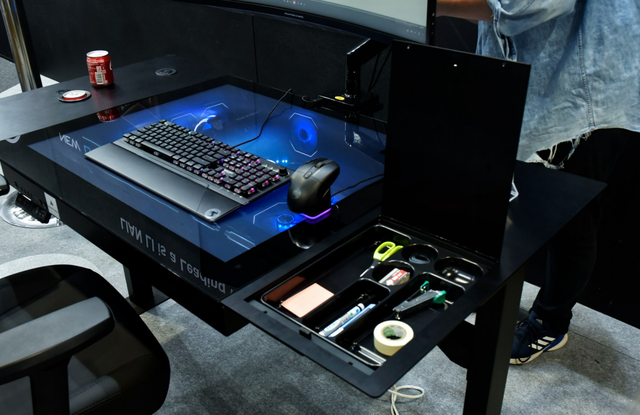 除了电控雾化玻璃面板,DK-07电脑桌还注重用户的使用体验。它配备了创新的水杯模块,位于左侧,可以制冷或制热饮品。这不仅为用户带来清凉或温暖的享受,还能在紧张的工作或游戏时刻保持清醒和舒适。同时,在桌面的右侧设置了一个小型储物空间,方便用户存放常用物品和配件,使工作区域整洁有序,提高工作效率。