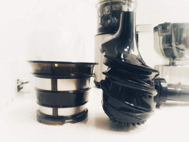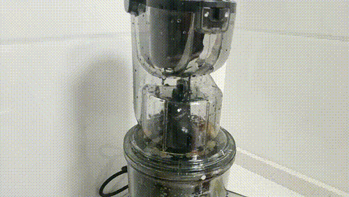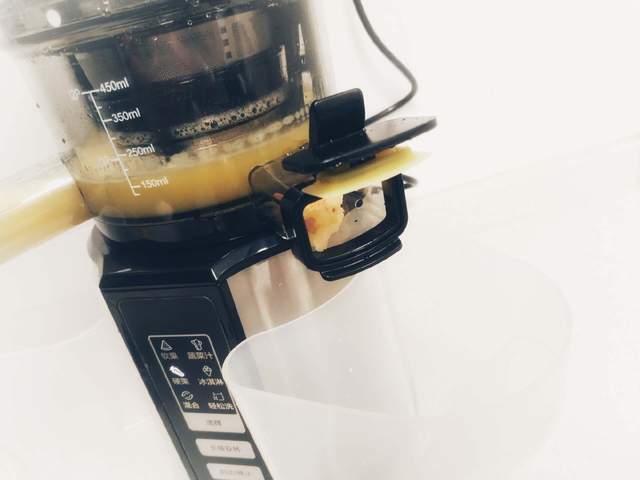 苹果在我看来还是较硬的水果,一度担心放入后的榨汁效果。不过一切都不用担心。7段螺旋推进器上小下端宽的结构顺利的将苹果导在下端并压榨。稍等时间就只有渣渣和汁汁了。