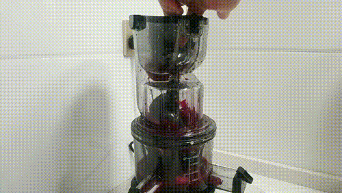 榨汁机的杯盖有双入口设计,一处是90mm的大口径口,能放入一整个苹果和橙子,避免买到稍大一点的苹果需要切块的尴尬,另外一侧是放置推料棒的入口,如黄瓜、萝卜就可由此口放入,做到双入料口可同时实现果汁混榨。