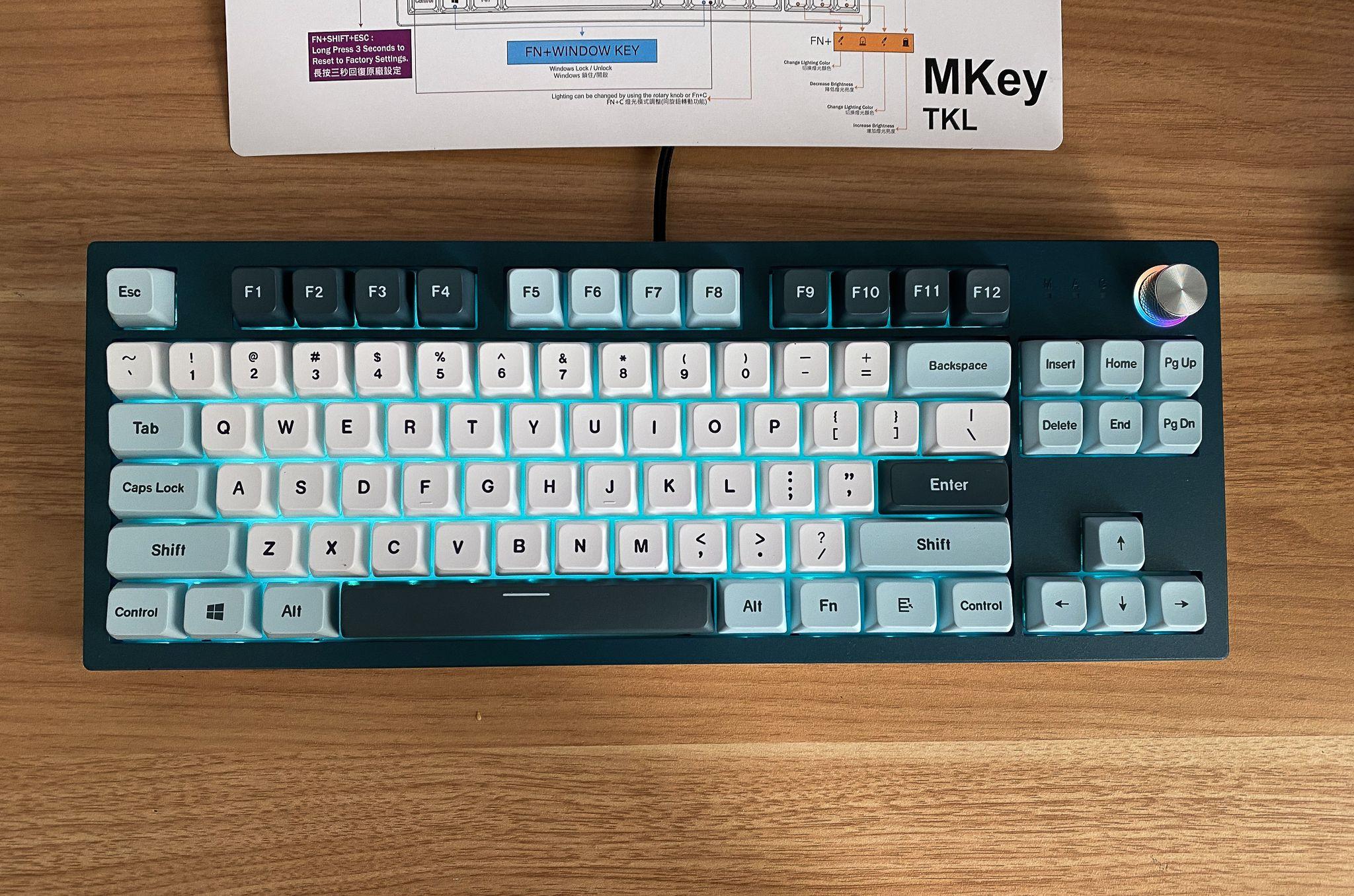 Mkey TKL是85键键盘, 右上角偶三个指示灯和一个银色旋钮。主键区是白色,功能键和底座是深浅不同的蓝青色,我们看它的配色,看起来非常的舒服,优雅大方。