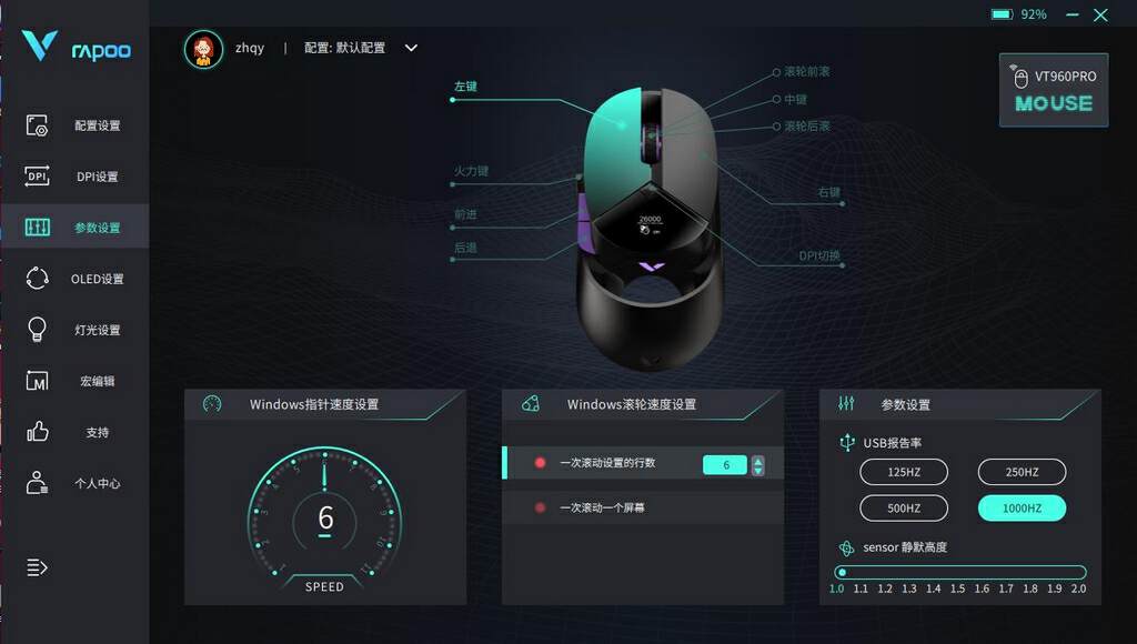 提示配对成功后,参数设置的USB报告率中多了 4000Hz和2000Hz选项,游戏时可设置最高,日常使用可设置最低挡可有效提高续航;
