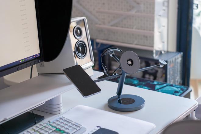 整体外观是很有科技感的深灰色,放在桌上简洁大气。中间的主支撑可以放平板,12.9寸以下的支持横竖两种摆放方式,左右侧杆分别可以摆放手机和带磁吸的智能手表,后杆可以摆放带磁吸的头戴式耳机,有了它,之前那些廉价凌乱的支架,就可以闲置了,整个桌面都清爽高级起来。