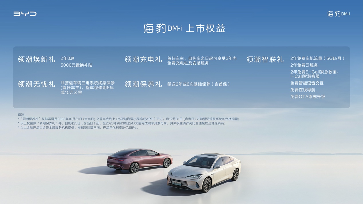9月6日,比亚迪海洋网“新一代主流中型轿车”——海豹DM-i正式上市,新车共6款车型,售价为16.68万-23.68万元,并为用户准备了2年0息、5000元置换补贴;赠送6年或6次基础保养;首任车主非营运车辆三电终身保修等多重上市礼遇。凭借三大主流新价值、五大领先产品力,海豹DM-i将为消费者带来前所未有的全新用车体验,重塑主流中型轿车价值标杆,加速中型轿车向新能源迭代的进程。