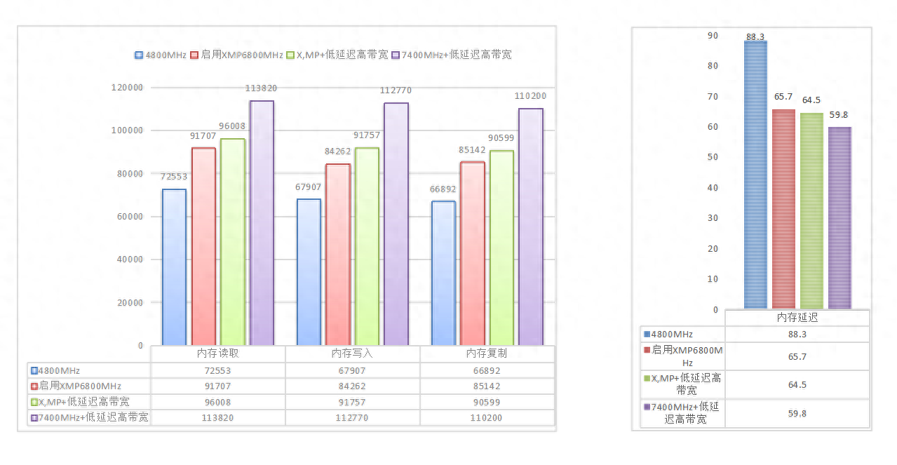将数据做个统计图表,可以更清晰的看到数据的变化。开启低延迟高带宽后,性能较没有开启,会有进一步提升。同时,技嘉这款小雕WIFI主板的表现出色,可以在内存XMP的标称频率后继续提升,深度挖掘内存的潜力,表现很好。