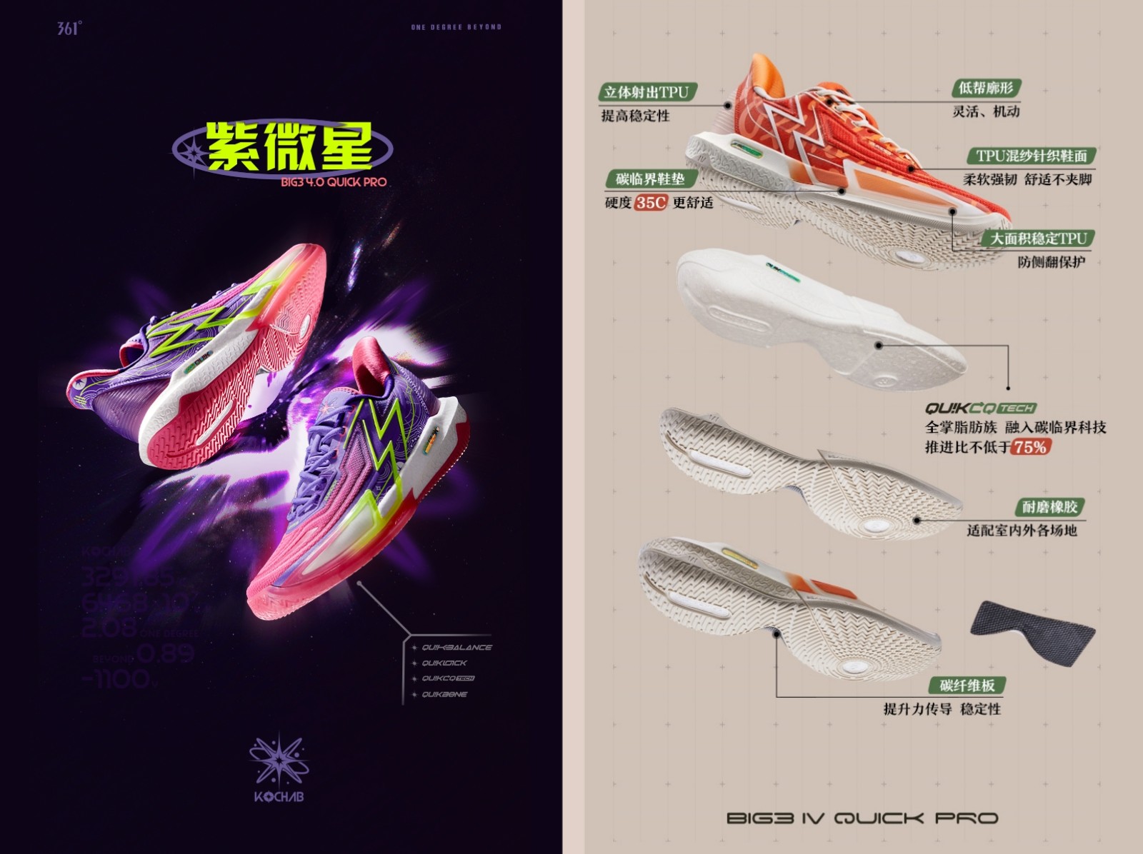 BIG3 4.0 Quick Pro 紫微星,整双鞋的配色由紫色和粉色的渐变组成,过渡效果做的很自然,鞋底也用上了水晶底和橡胶底来适配这个配色外侧鞋面上印有很多天文学知识,有关于紫微星的信息都在鞋子上呈现出来,大3LOGO的荧光绿点缀更加贴切主题锋利感十足。