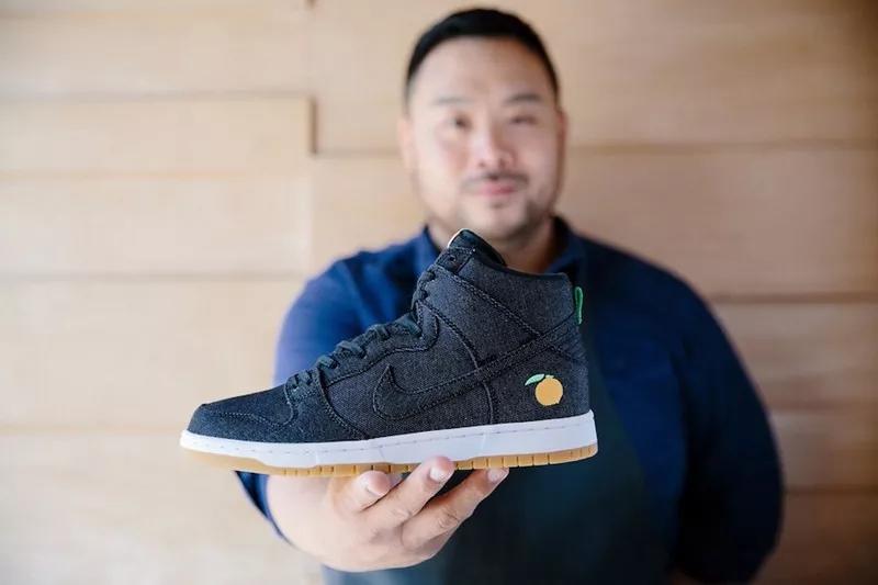 8.去年发售的Dunk SB系列中,让我印象很深的一双鞋, Nike SB携手著名餐厅创办人兼主厨 David Chang 展开合作带来的全新联名,鞋面以餐厅深色围裙为灵感,采用优质单宁面料制作而成,并别出心裁的将 Momofuku 招牌的柠檬 Logo 以刺绣形式呈现于后侧。