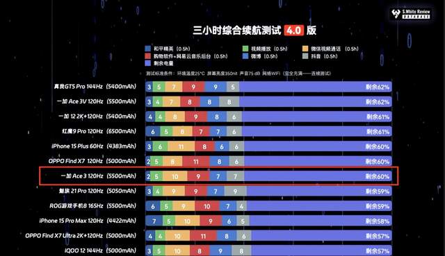 一加Ace 3在续航方面同样表现不俗。它内置了一块5500mAh的大容量电池,足以支撑长时间的使用需求,无论是观看视频、玩游戏还是日常使用,都能保证充足的电量。同时,100W的超级闪充技术让充电变得快速便捷,只需要 25 分钟就能充满整个电池,让综合续航体验更加出色。从小白测评最新的三小时综合续航测试4.0版来看,一加Ace3并列排名第5,续航在同档位应该是第一的。