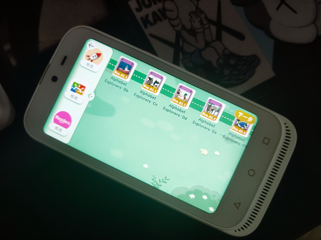 从正面来看,这款学习机的屏幕尺寸从原来的小屏,提升到了4.1英寸的超清大屏,视野开阔了不少,同时底部的散热孔让我感觉它又有点像滑盖手机,整机清新的白色设计,让人有不错的第一印象。