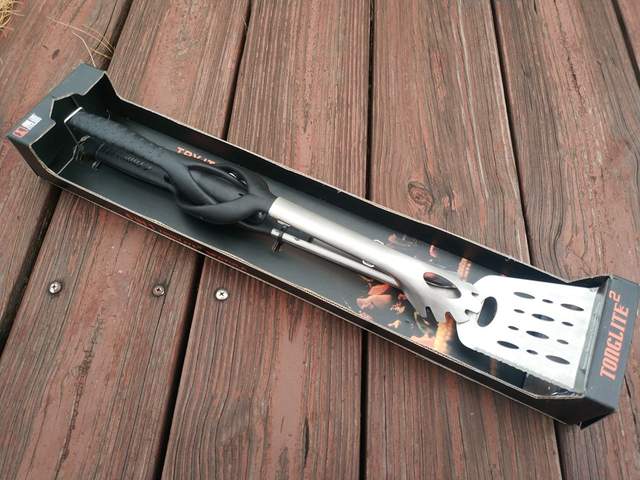 盒体的背部是这款带铲子烧烤夹的功能介绍。简单来说就是可以夹,可以伸缩夹头,铲子的一侧带有锯齿方便切割食材,铲子中的圆孔可以做啤酒起子....哦,还配置了光源,晚上烧烤就很清晰了。