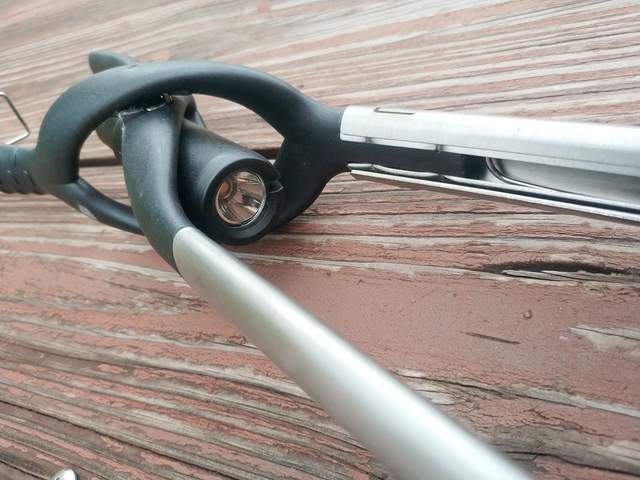 夹子的转轴中央配置了手电(这里顺带说明,配置的光源是纳丽德出品的),夜间烧烤的时候打开手电就可方便我们观察美食的烹饪过程,以方便掌握火候。