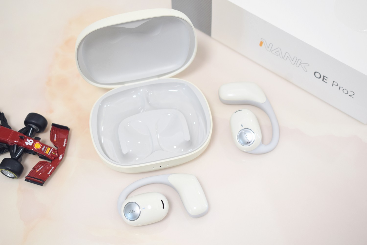 NANK南卡OE Pro2开放式耳机抽屉式包装设计,内部包含了耳机、电池仓、Type-C充电线和产品说明书。