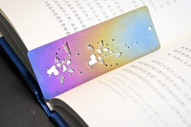 书签不大(长100mm,宽35mm,厚0.5mm,重8.11克),呈长条状方形,边缘处特意做了圆角处理,不会刮手。钛合金在高温下会呈现出不同色泽的颜色。俗称“烤蓝”。处理过的钛制书签自上而下,色彩绚烂而不一,加之镂空的两尾锦鲤,在整体上给人和谐美好的舒适画面和灵动之感。拿在手上还是很漂亮的,可以说是爱不释手。