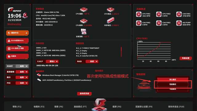 七彩虹主板现在的默认配置其实还不错,但想满血使用265K得稍微调试下,首次使用记得更新下BIOS,第一步按照下图,将智能超频模式切换成性能模式。